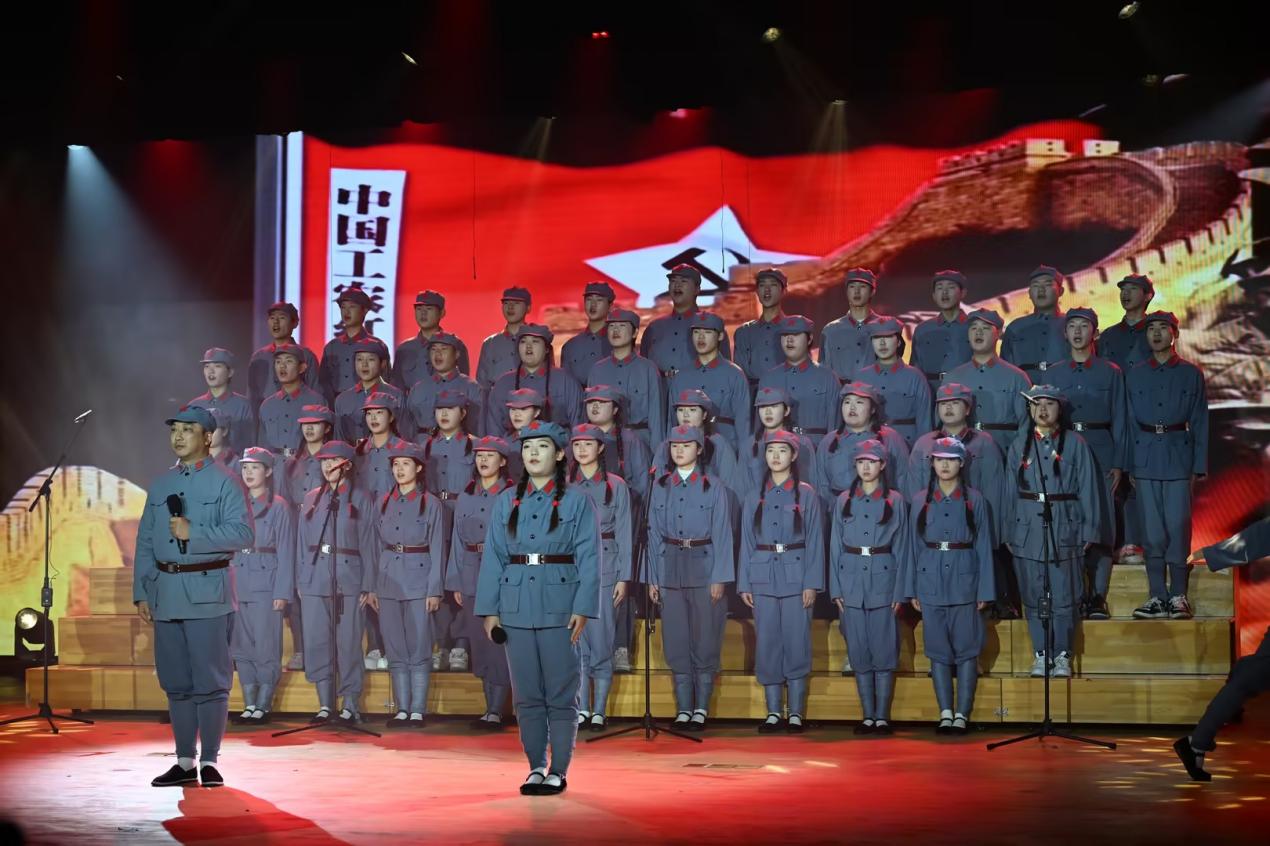 比赛中,学院各党支部和团总支共选送了12支队伍同台展示。党员教师们先后呈现了《中国人》《映山红》《南泥湾》《领航》等经典曲目,用真挚的情感、嘹亮的歌声诠释了党员的责任与担当;团员同学们以《红旗飘飘》《四渡赤水出奇兵》《我爱你中国》《天耀中华》等歌曲献礼,展现了新时代青年的昂扬风貌。参加表演的师生们精神饱满、编排精巧,舞台上灯光与旋律交融,歌声与掌声共鸣,一首首红歌穿越时空,既重现了救亡图存的峥嵘岁月,又唱响了新时代的奋进之歌。演出接近尾声,学院广播台的同学们还特别奉献了情景舞台剧《我有一束光》,以深情演绎传递信仰力量,赢得了全场阵阵掌声。